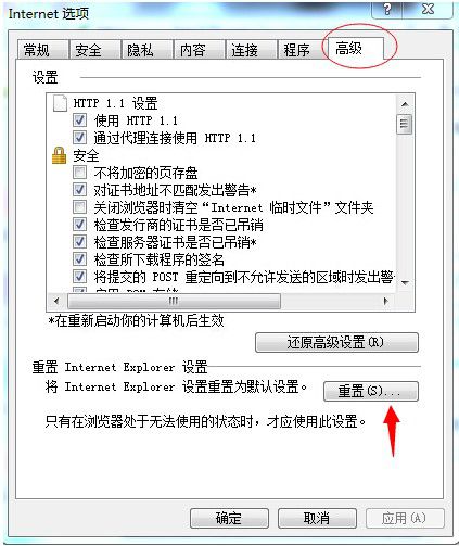 (2)    重置下IE浏览器。点击Internet选项里的高级,然后点击重置