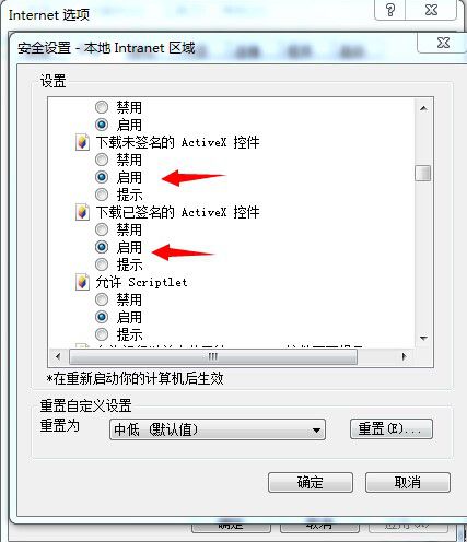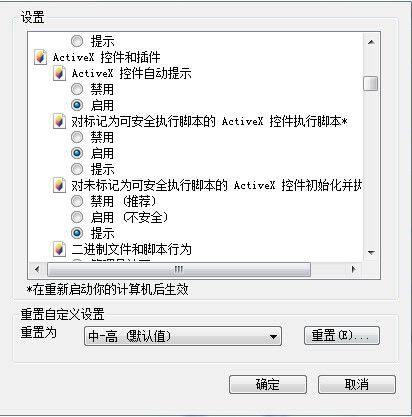 Internet,本地intranet和受信任的站点设置Active控件和插件的启用。