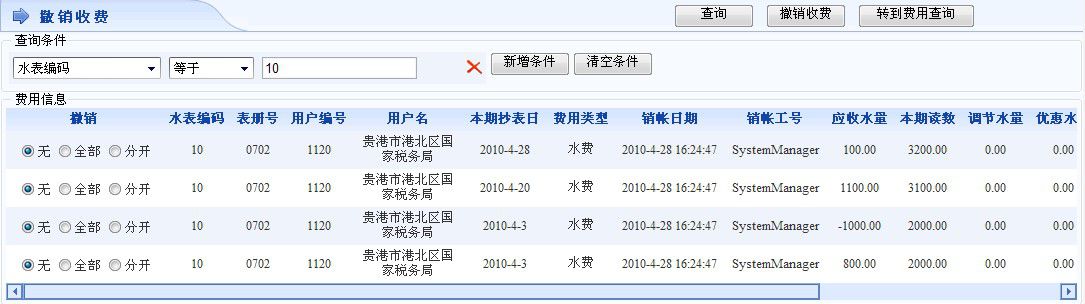 系统默认是“无”即要操作员自己选择要撤销的费用。撤销操作之后费用就处于未缴费状态,营业厅收费那里又可显示该费用了。