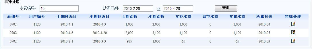 需要对7月份的抄表进行特殊处理,实收应该是60度水,那么在实收数量处输入60即可。特殊处理之后就会出现三比记录分别如下: