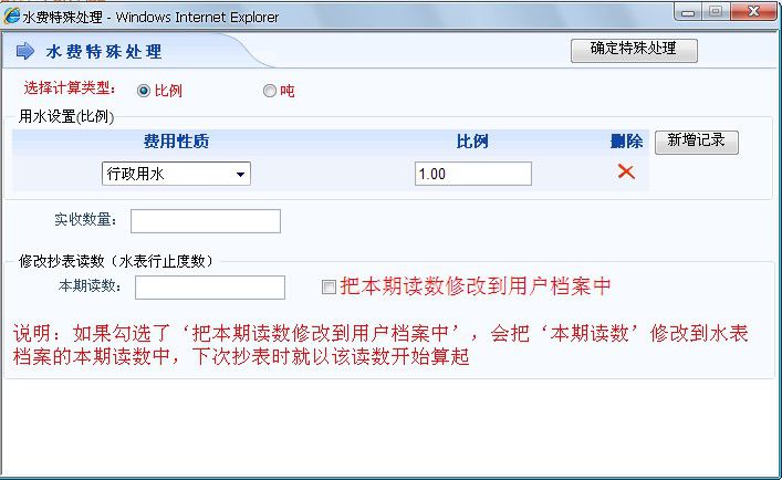 把本期读数修改到用户档案中:当特殊处理的是最近一个月且本月还未抄表,此时就会本期读数到用户档案中,表示下次抄表就从这个读数开始计算。