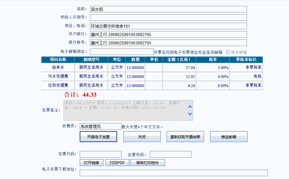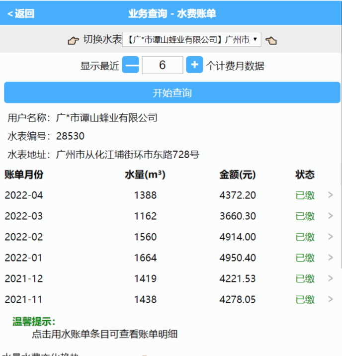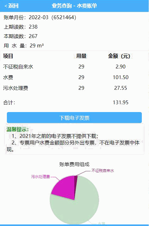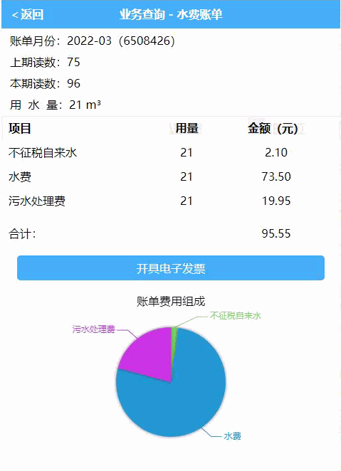 查询用水清单,某个月未开票时,点击该月记录即可开具电票,若已开可下载电票。