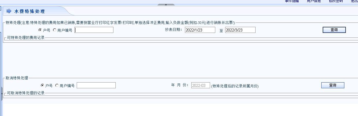 水费特殊处理功能和退款功能操作方法一致。只能处理未销账的水费。